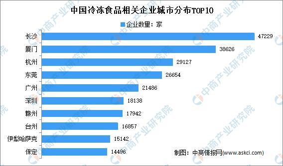 从城市来看,长沙市冷冻食品相关企业数量最多的,达4.7万家。冷冻食品企业前十的城市中,多数